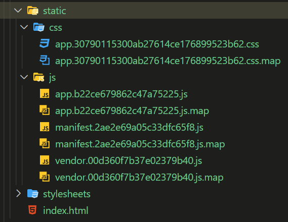 5. 빌드가 완료되면 backend(express) 프로젝트의 public/index.html 파일과 pulbic/static 하위에 css, js파일들이 추가되어있다.